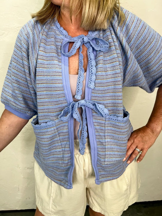 Features: Comfy cotton terry fabrication, open-front design, crochet lace tie closure, patch pockets, ribbed contrast trim, puffed raglan short sleeves